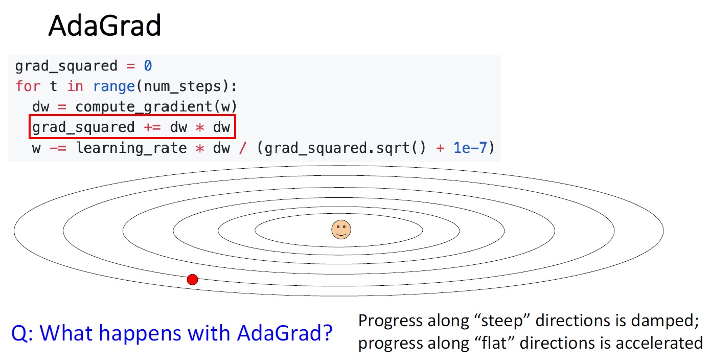 학습률에 이전의 기울기의 제곱근을 나눠주므로 학습률이 낮아져서