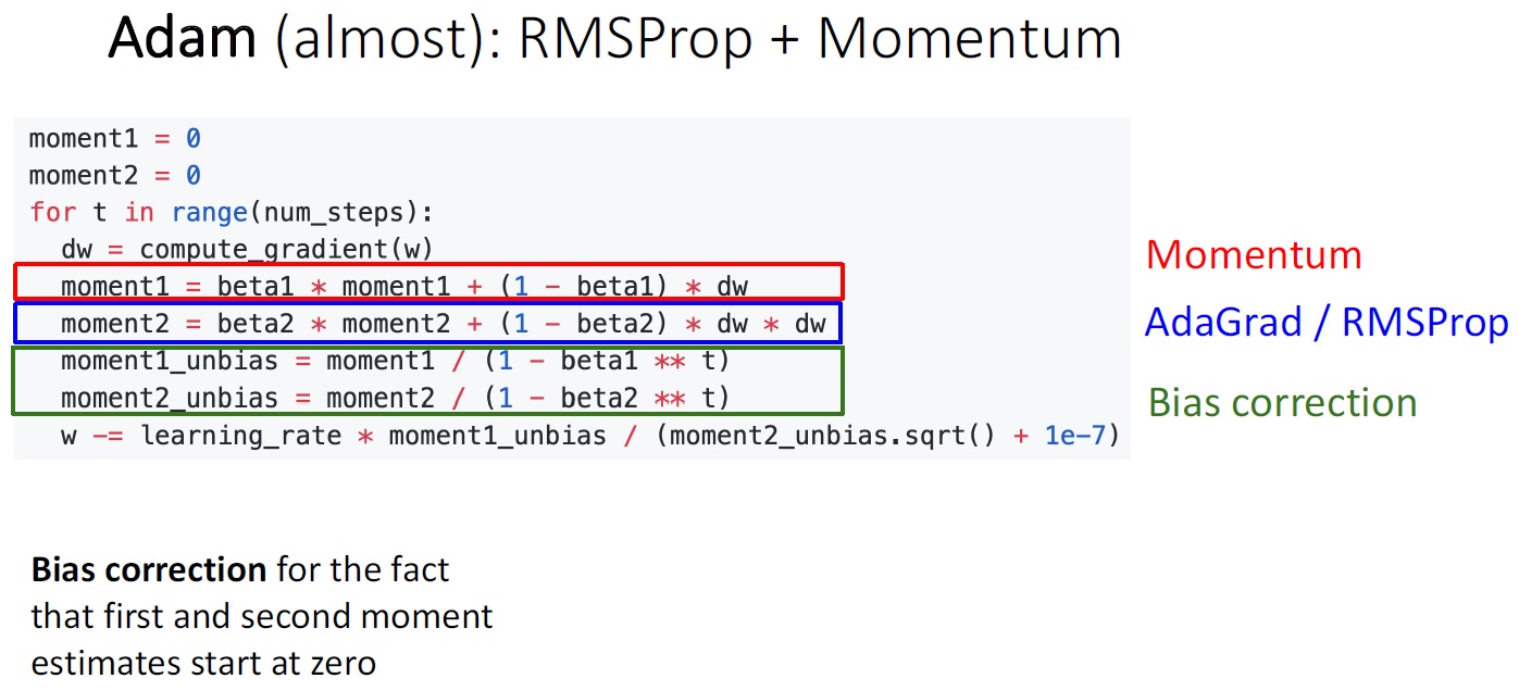 즉 adam은 RMSProp에 모멘텀을 합친 것이다.