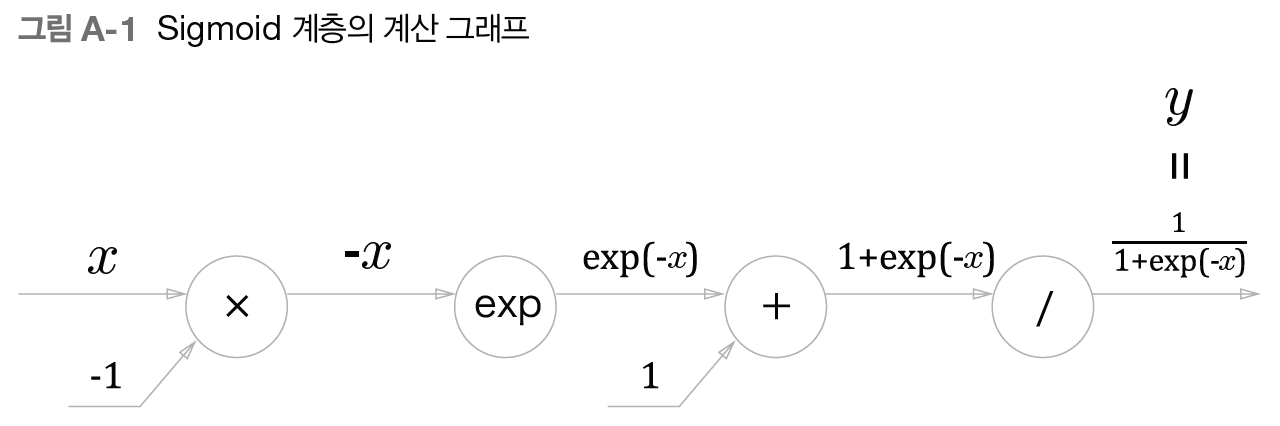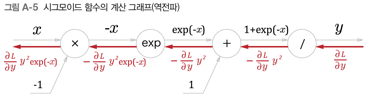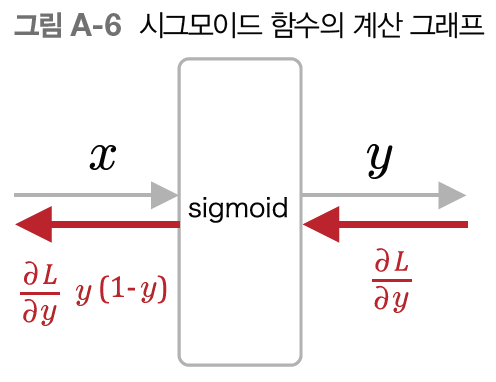 활성화 함수로 쓰인 sigmoid 함수 f를 통과했을 때의 순전파와 역전파시 계산의 흐름을 나타낸 것이다.