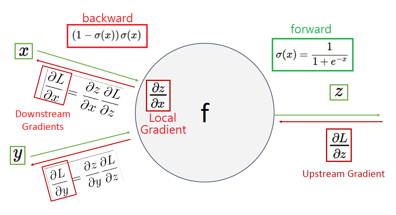 우리가 구하고자 하는 downstream gradient는 local gradient와 upstream gradient의 곱셈(chian rule)으로 얻어진다.