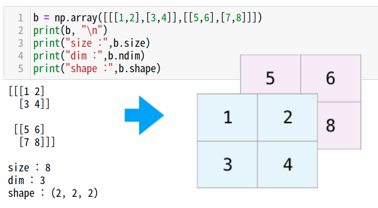 각 행렬이 3차원 상에 배열된다. [ [[1,2] , [3,4]] , [[5,6] , [7,8]] ] >>> dim3