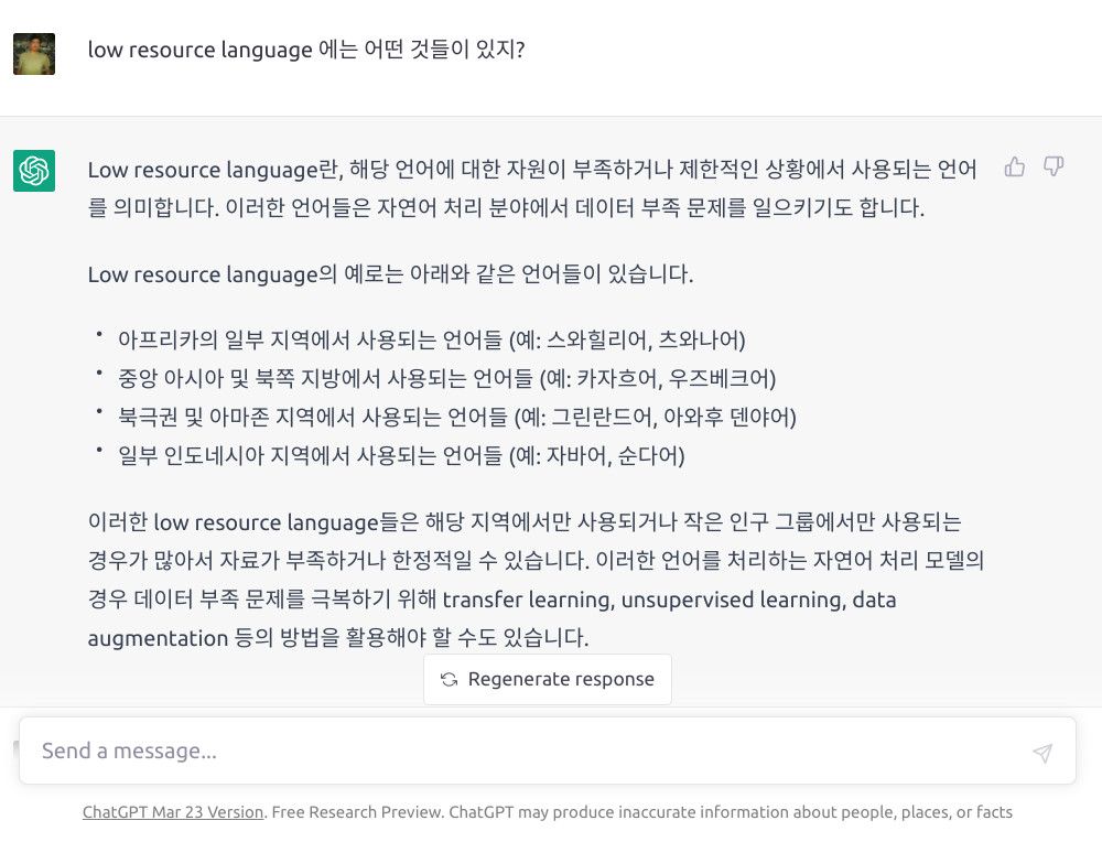 그럼에도 불구하고, 2023년 3월 기준 chatGPT에게 low resource language인 한국어로 질문을 했을 때