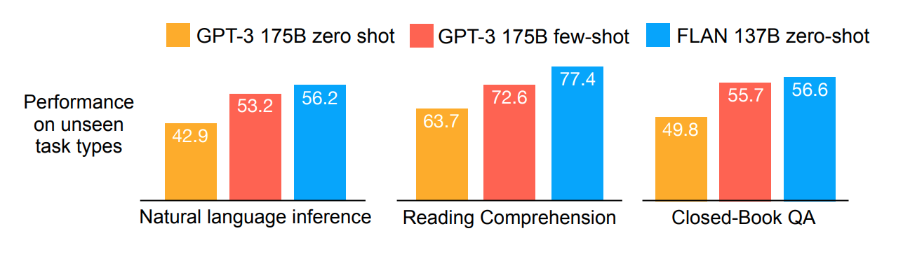 정리하면, FLAN의 의의는 GPT-3보다 더 작은 모델을 fine-tuning 하여