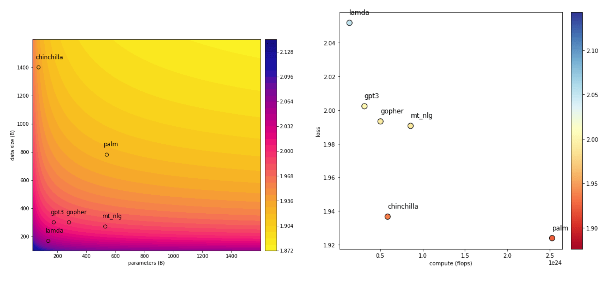 아래 그림은 Chinchilla 논문의 주요 내용을 다룬 블로그에 있는 그래프 입니다.