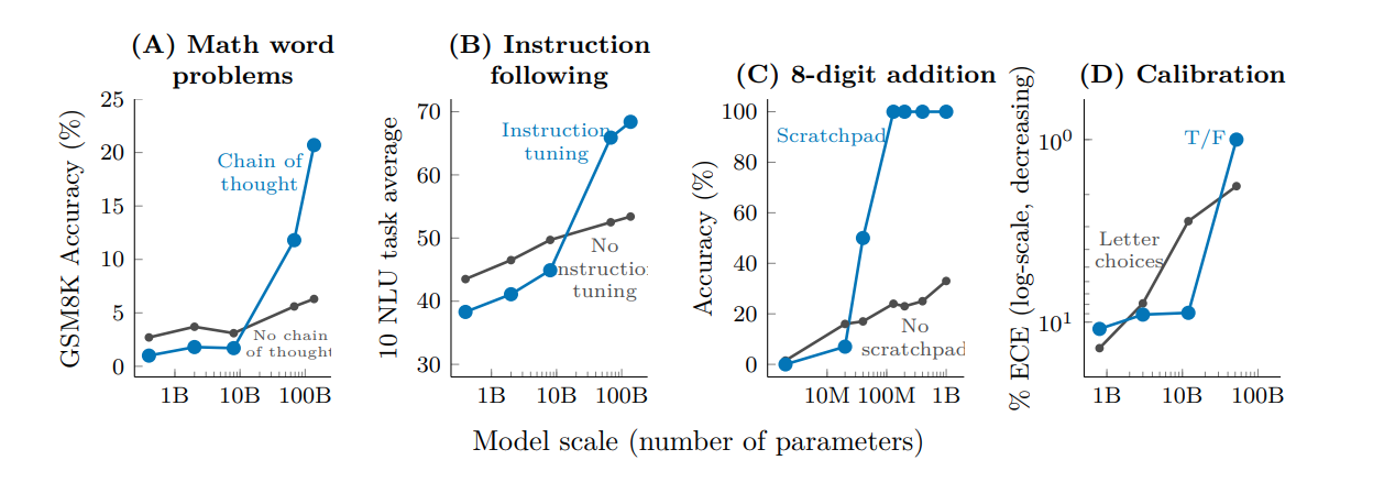 모델 크기가 일정 수준을 넘어야만 해당 고급 기법들을 썼을 때 Emergent abilities가 나타나는 걸 볼 수 있습니다.