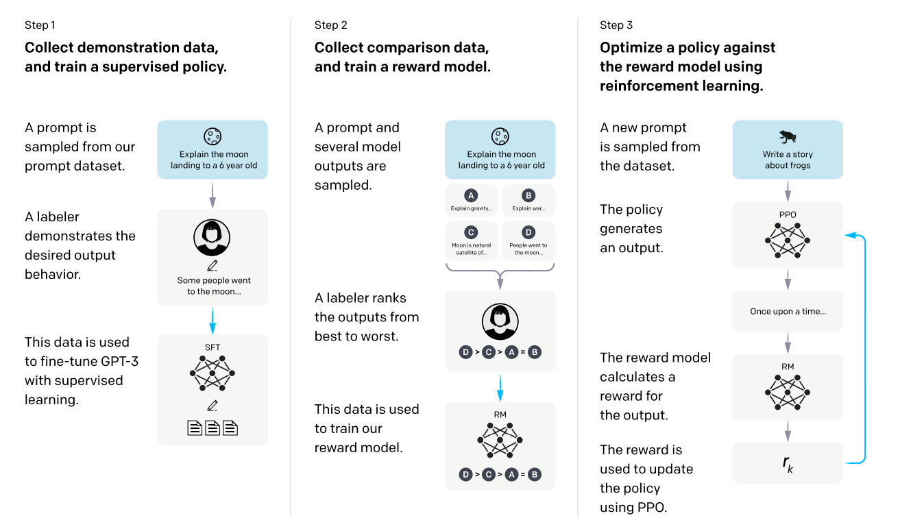 이로써 chatGPT의 첫번째 버전인 InstructGPT가 탄생하기 위한 씨앗이 모두 뿌려졌습니다.