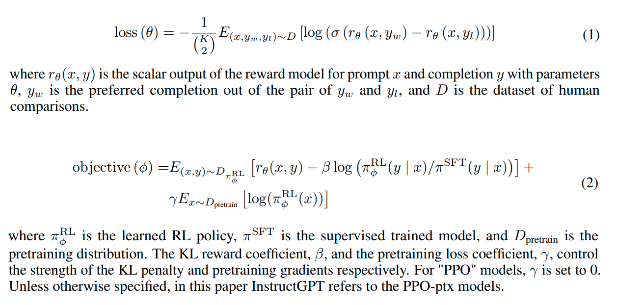 이제 InstructGPT의 RM에 사용되는 손실함수와 RL에 사용되는 목적함수는 각각 아래와 같이 수식화할 수 있습니다.