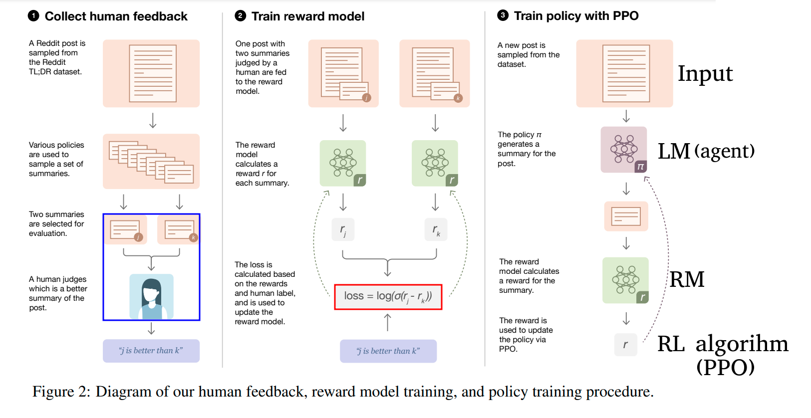 Learning to summarize from human feedback 에서의 3단계 프로세스와 매우 유사함을 볼 수 있습니다.
